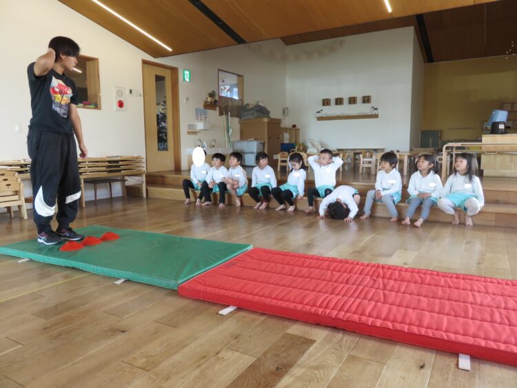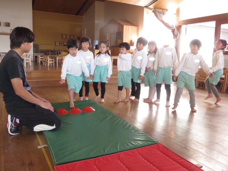 赤いコーンを踏まないように、手を前に置いて何度も練習していました