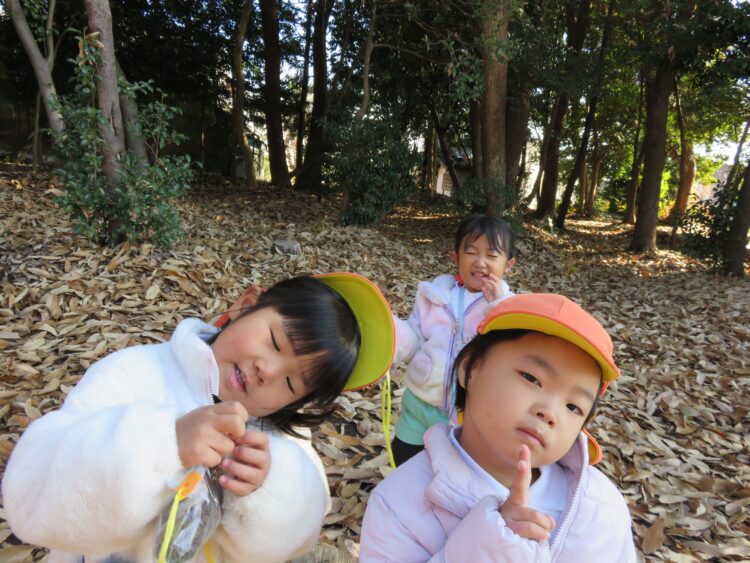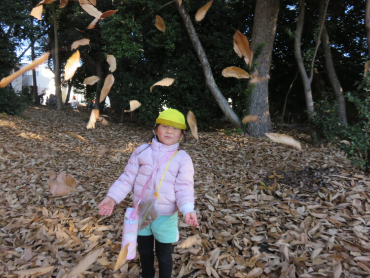 木の実や枝、どんぐりの帽子など、宝物をい~っぱい見つけると、夢中で拾ってお散歩バッグの中へ