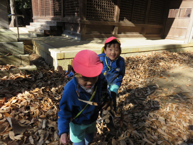 ふかふかの感触やカサカサ鳴る音を楽しみながら、神社の奥へと冒険へ