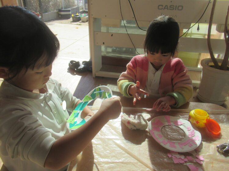 折り紙や毛糸、モールやどんぐりなど、いろいろな素材を使って工夫する子どもたち