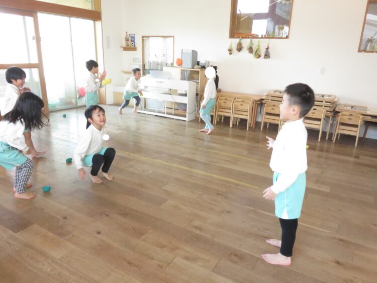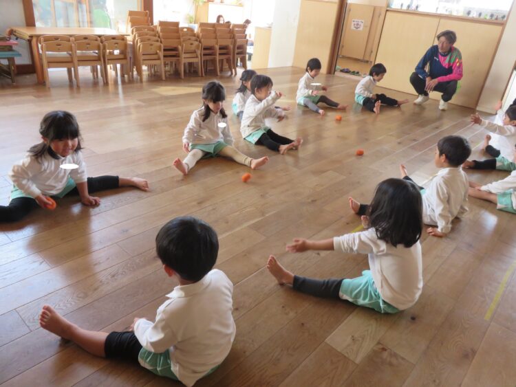 お友だちとペアになり、ボールを転がしてキャッチ!