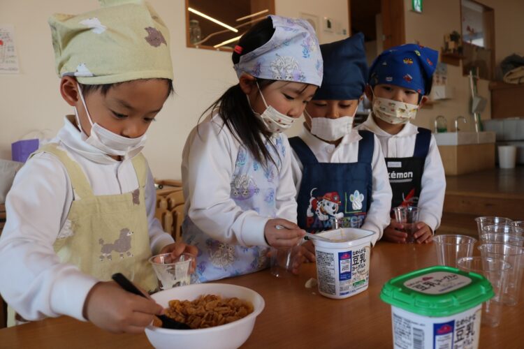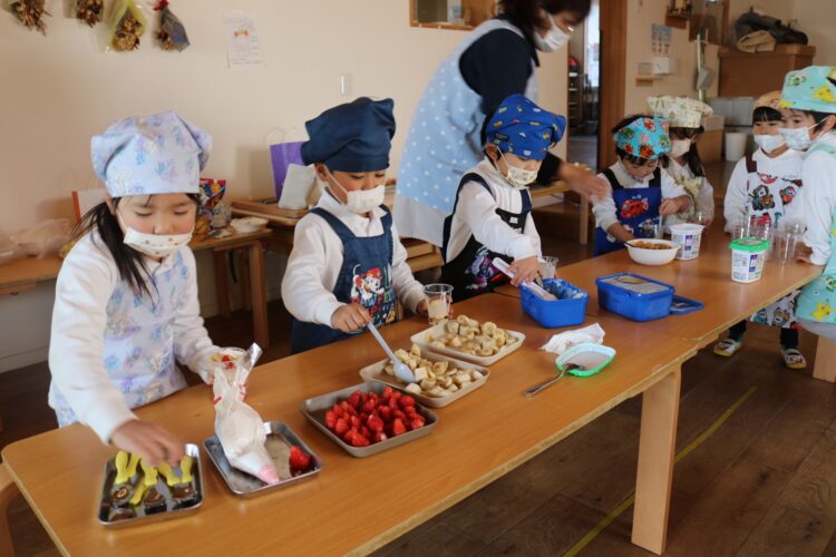 きらきらさんのお友だちが包丁で果物の下ごしらえを行い、わくわくさんのお友だちはトッピングを行いました✨