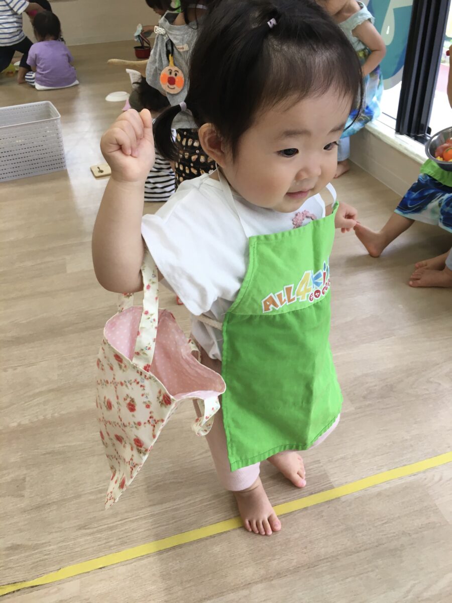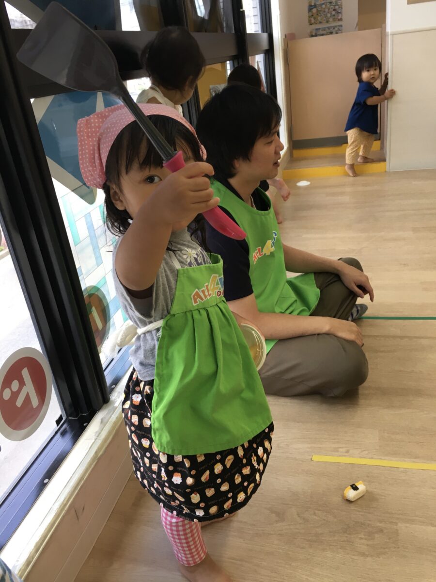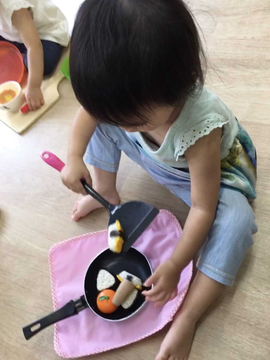 フライパンや鍋に食べ物を入れてかき混ぜたりして料理人になってみたり、エプロンをつけて買い物する主婦になってみたり、食べ物を盛り付けて先生にあげたりするなど、とても楽しく遊んでいました😆