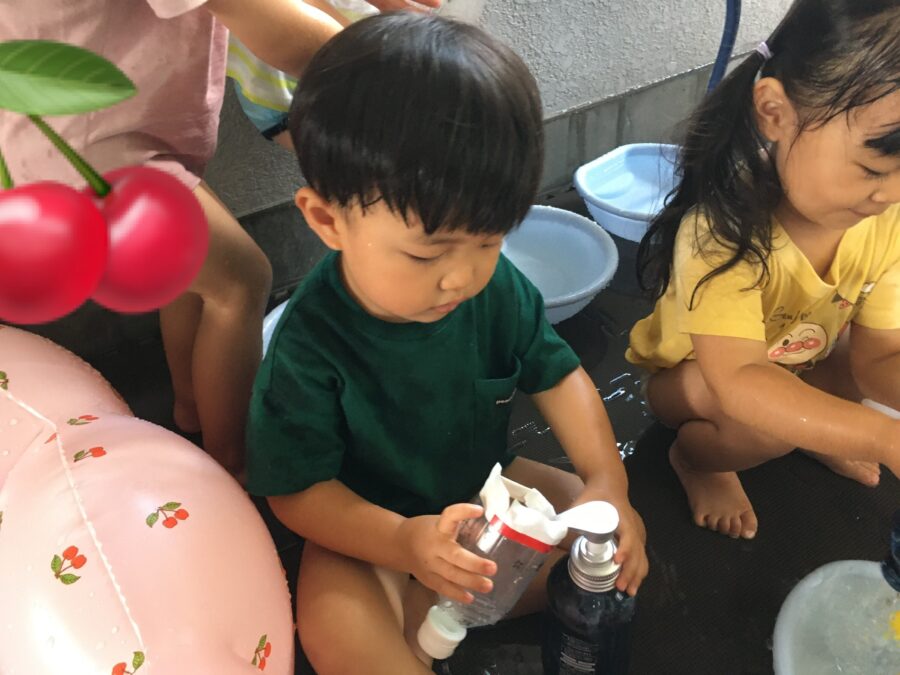 洗面器やジャンプーボトルに水を入れるとお友だちと一緒に体を洗ってさっぱり!