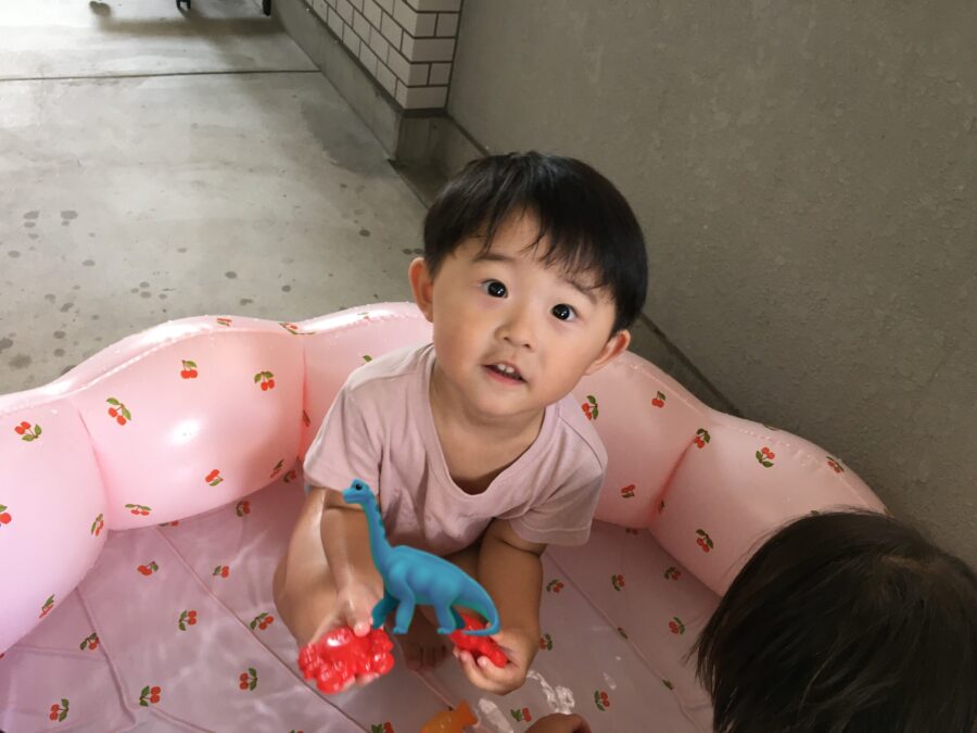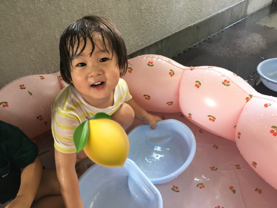 プールに入るとカニやお魚を集めたり入れ物に水を入れたりと楽しそうな子どもたち😆