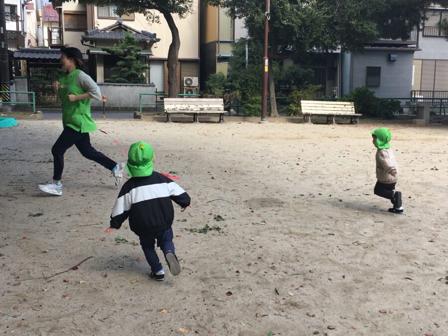 今日は、公園へ散歩に行き、みんなでしっぽ取り遊びをしました。