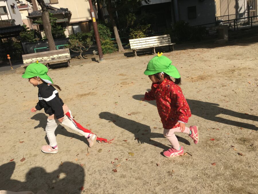 先生やお友達を「待て〜」と言いながら、元気に追いかけて、しっぽが取れると、嬉しそうに「付けて」と先生に渡して付けてもらっていました。