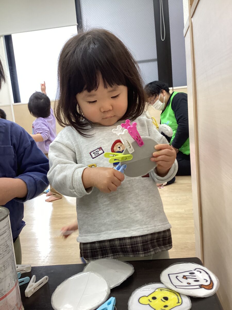 洗濯バサミをパネルにつけていくおもちゃは、色んなキャラクターのものがあり、特にプリンセス系のパネルは大人気✨👸