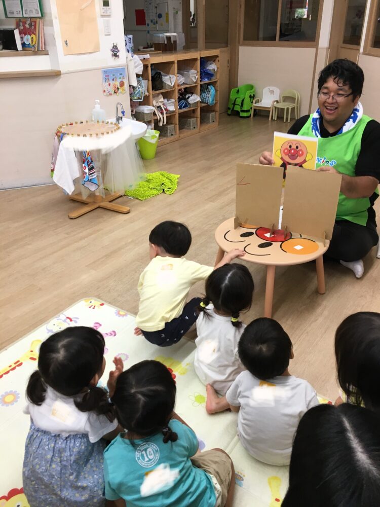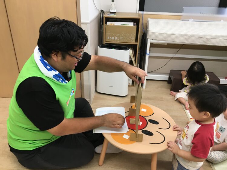 先生のクイズ遊びは、段ボールの隙間から見えるキャラクターを当てる遊びで、答えが分かると、「アンパンマン!」や「トーマス」など、元気にキャラクターの名前を言ったり、指を差したりしていました。