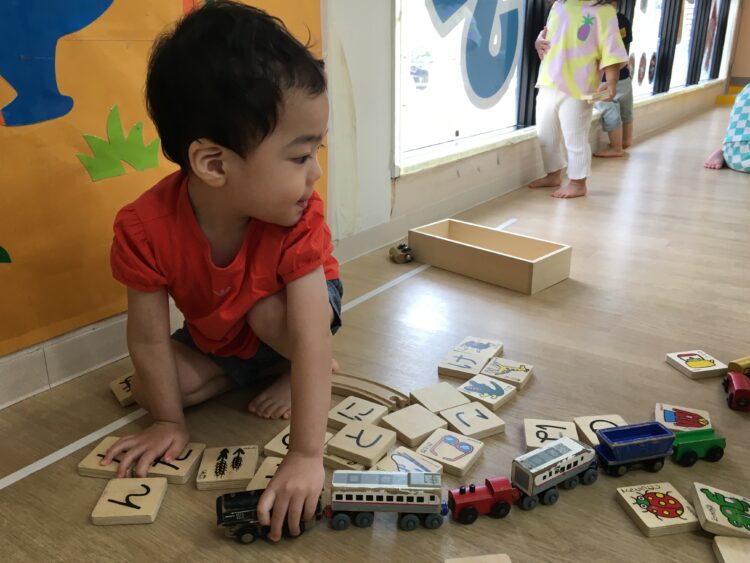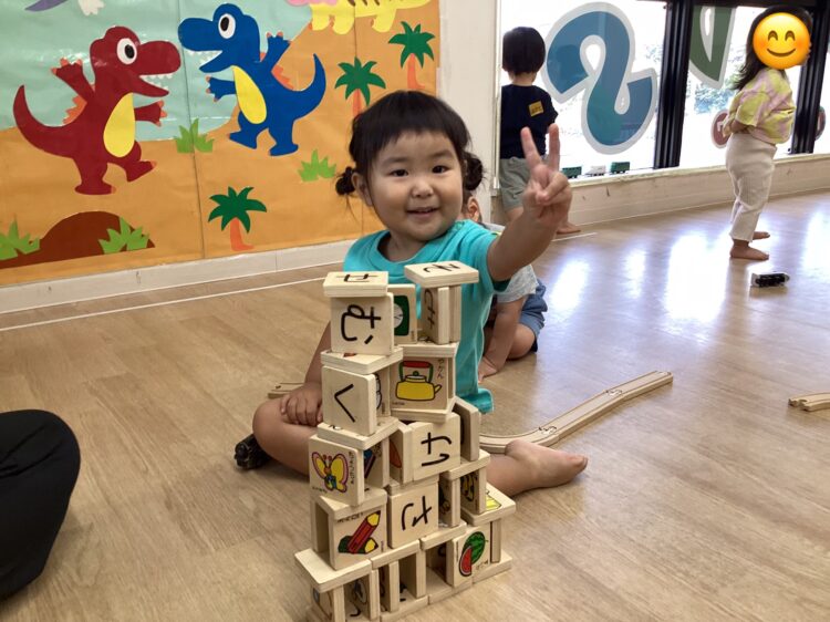 積み木で遊んでいた子は、タワーを崩れないように慎重に作ったり、ケーキを作って「せんせいにあげる」と言ってプレゼントしてくれたり、ドミノみたいに並べたりしていました。