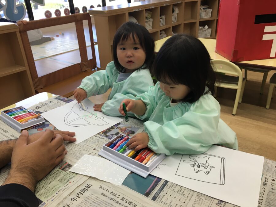 ばなな組さんといちご組さんは、車や絵本、ぬいぐるみのイラストの中から選んで色を塗りました。