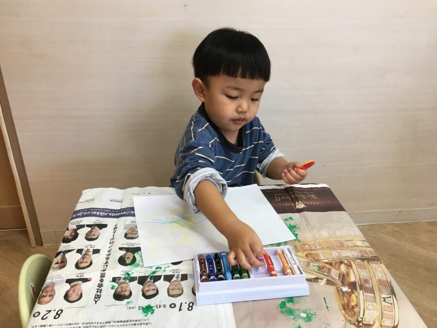 めろん組さんは白い紙に、クレヨンで思い思いの絵を描きました。