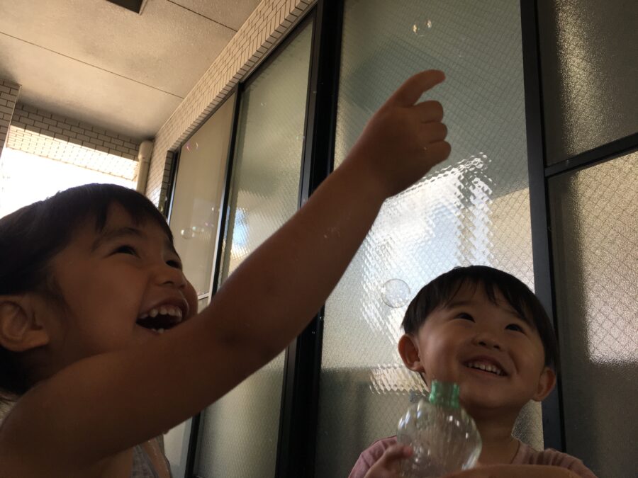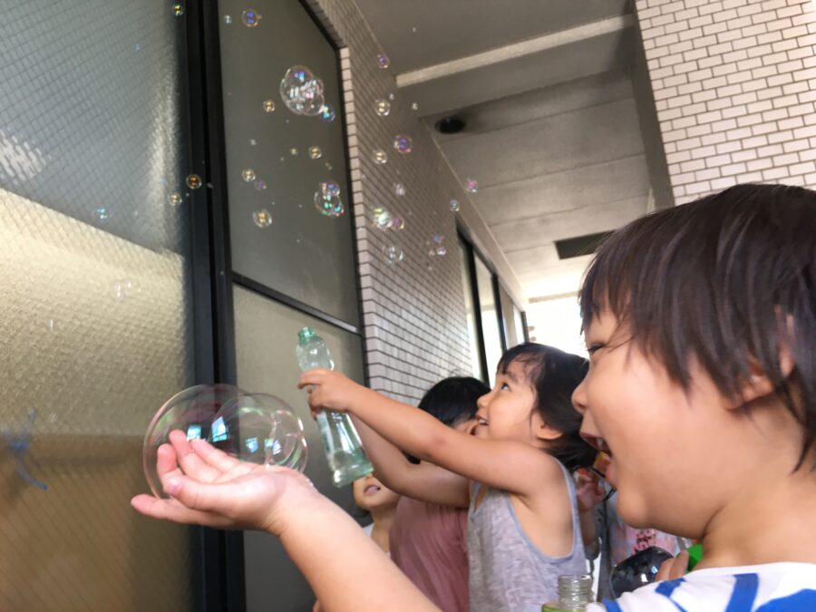 今日は、水遊びでシャボン玉をしました。