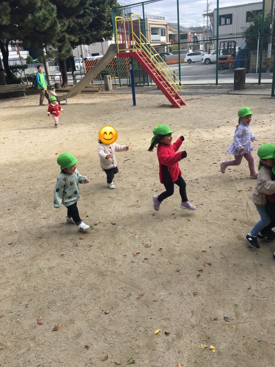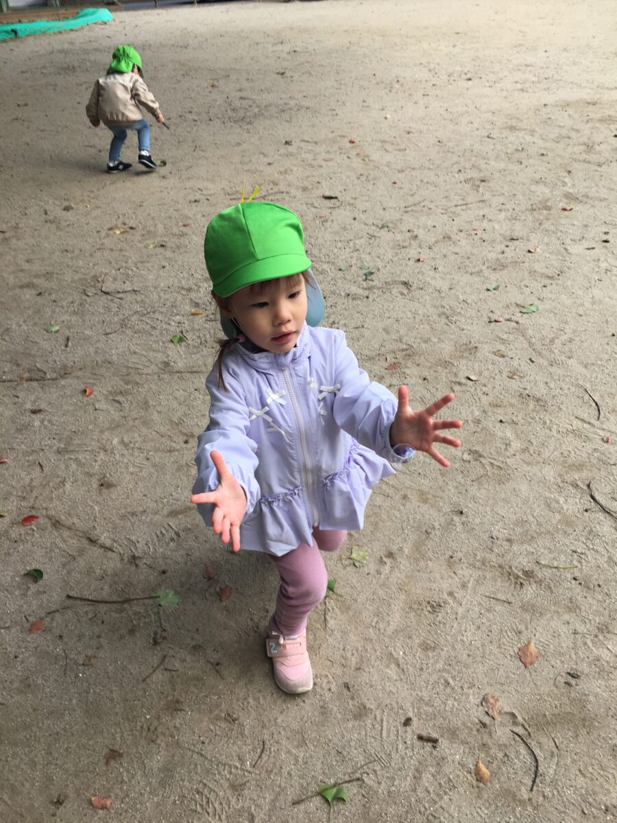 みんなでかけっこもしました。一列に並んで先生の掛け声を合図に、ゴールにいる先生を目指して一生懸命に走っていました。