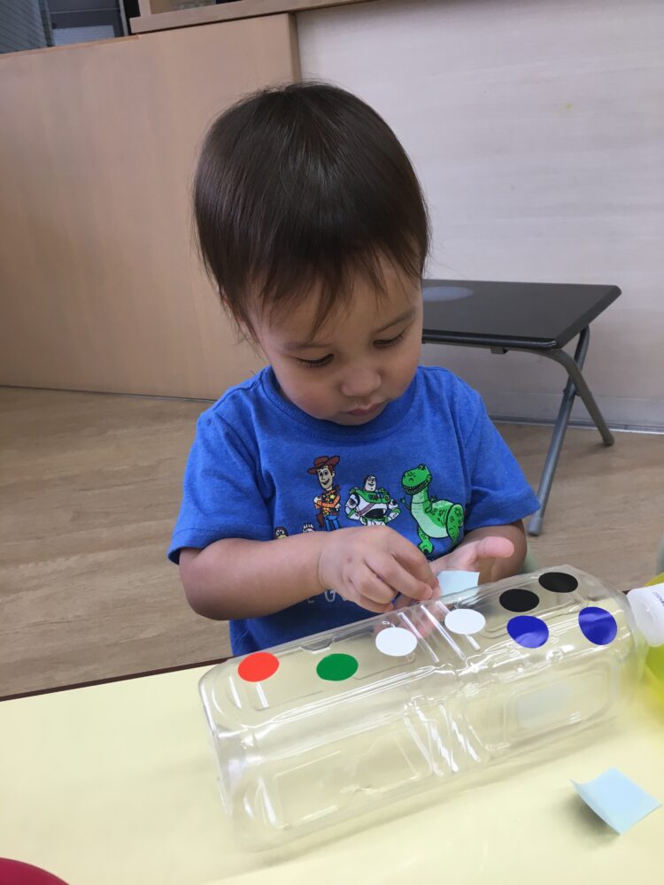 うまくシールの土台から剥がして、貼っていく子どもたち😆