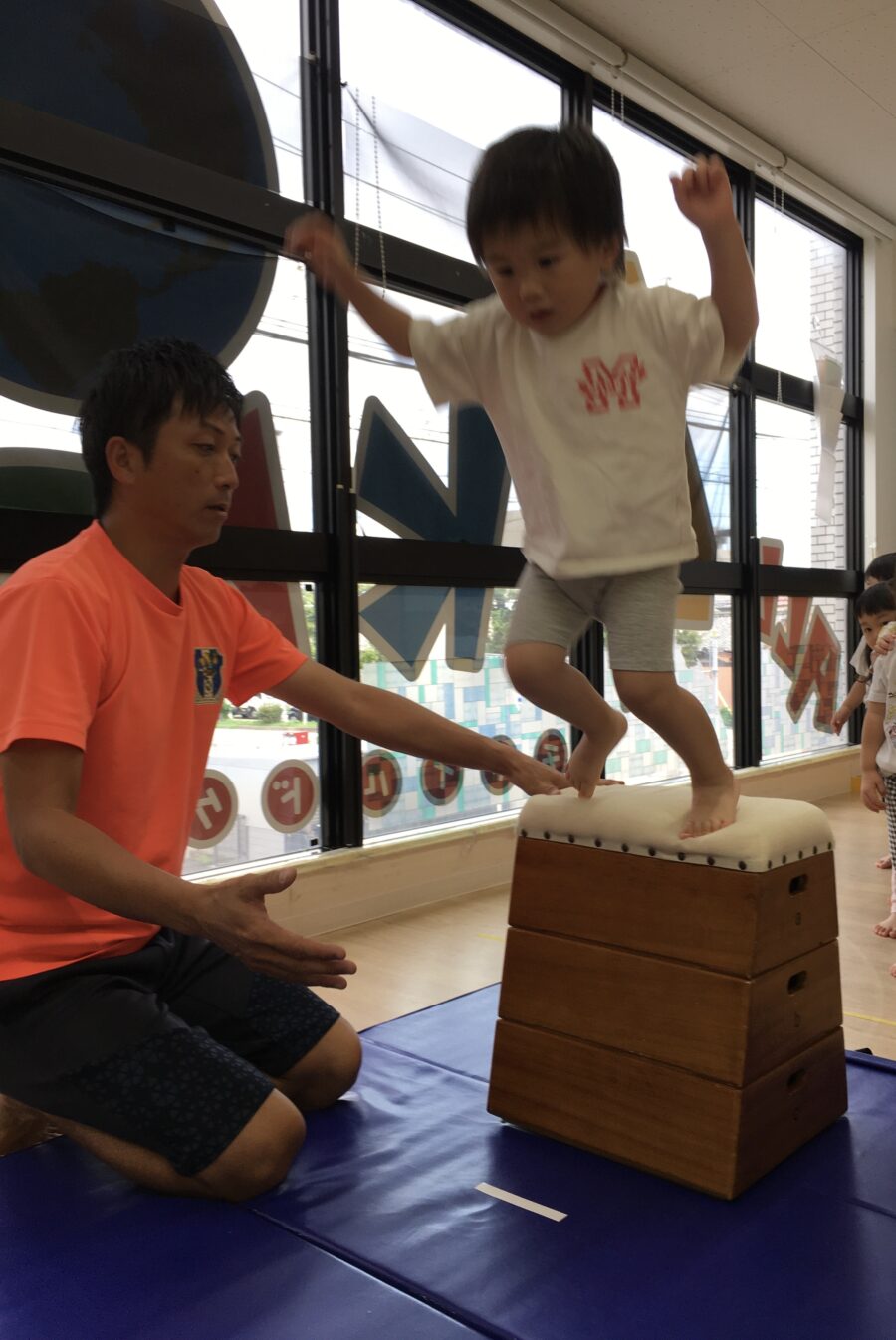 今日の体操教室では、めろん組さんは、跳び箱3段から降りることと、開脚跳びの練習をしました。みんな頑張って跳べていましたね。