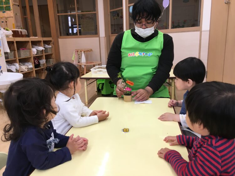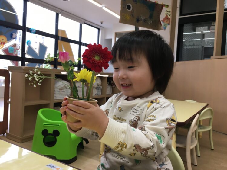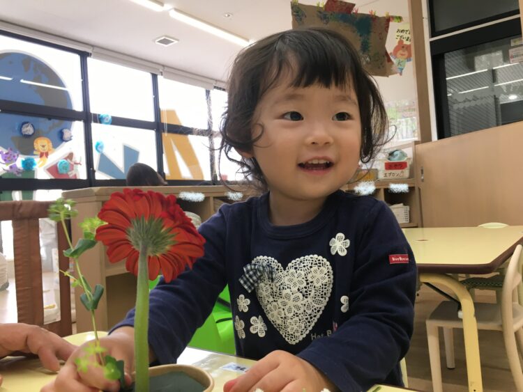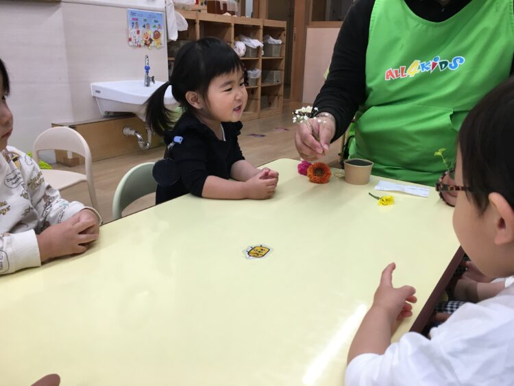 最近はお散歩でたくさんのお花を見ていたので、みんな興味津々!保育士のお話を一生懸命聞いていました。