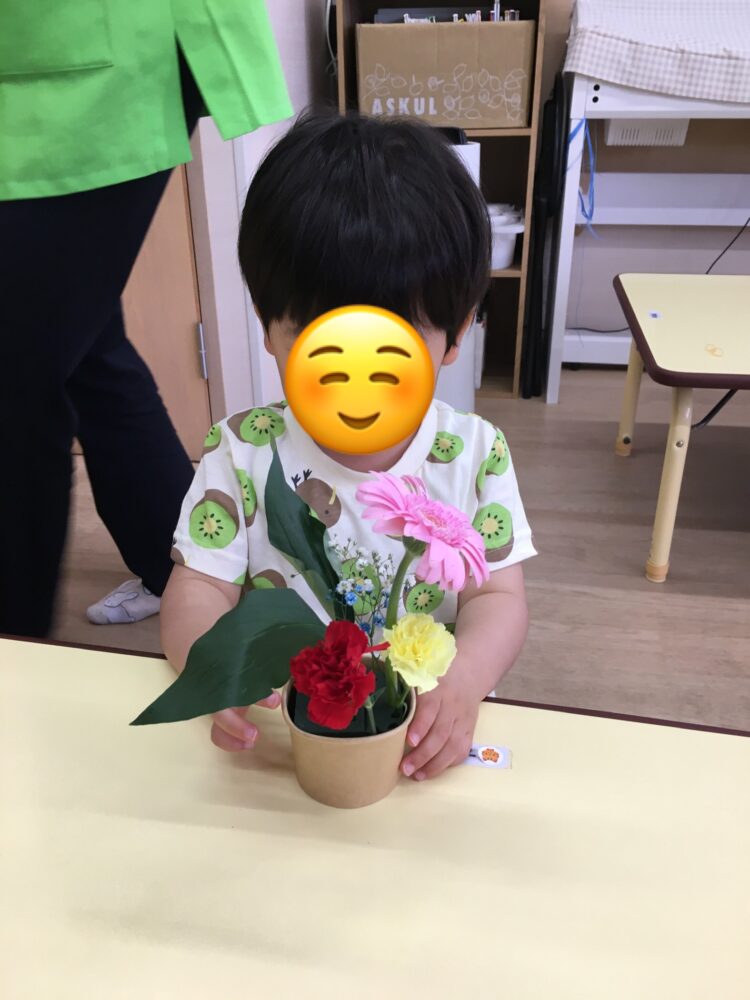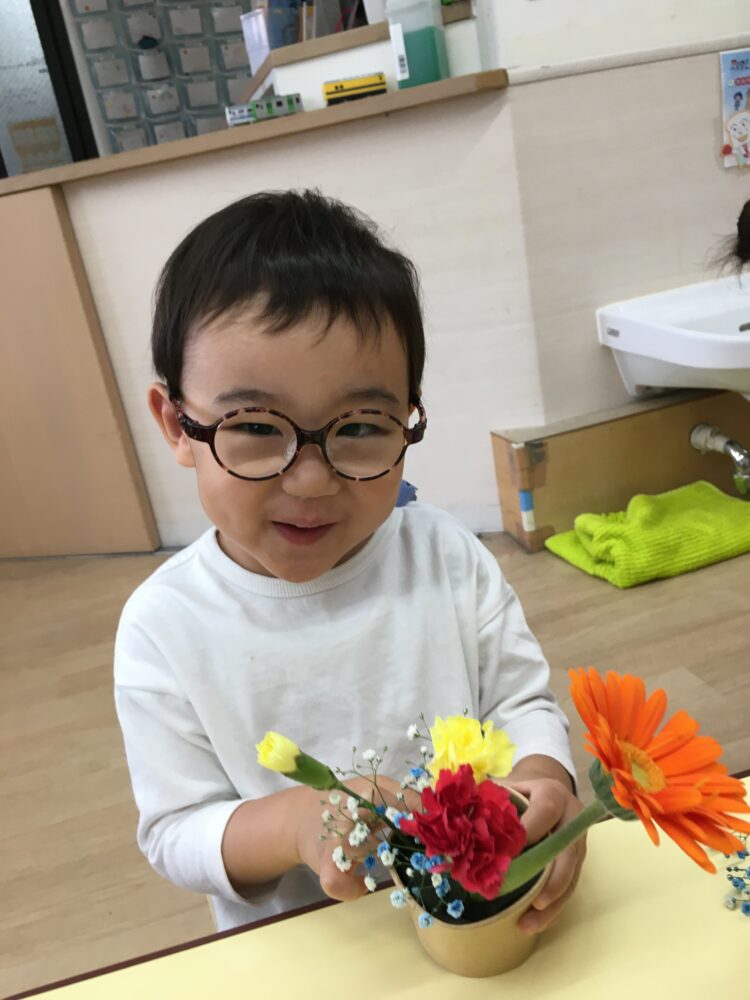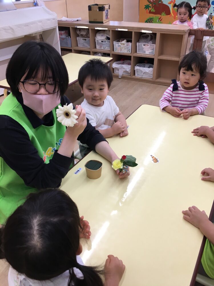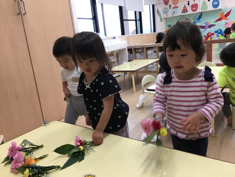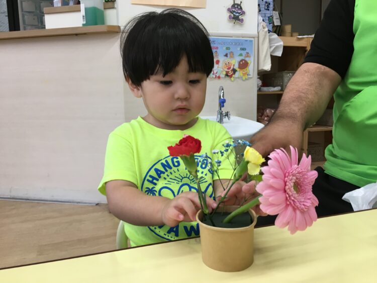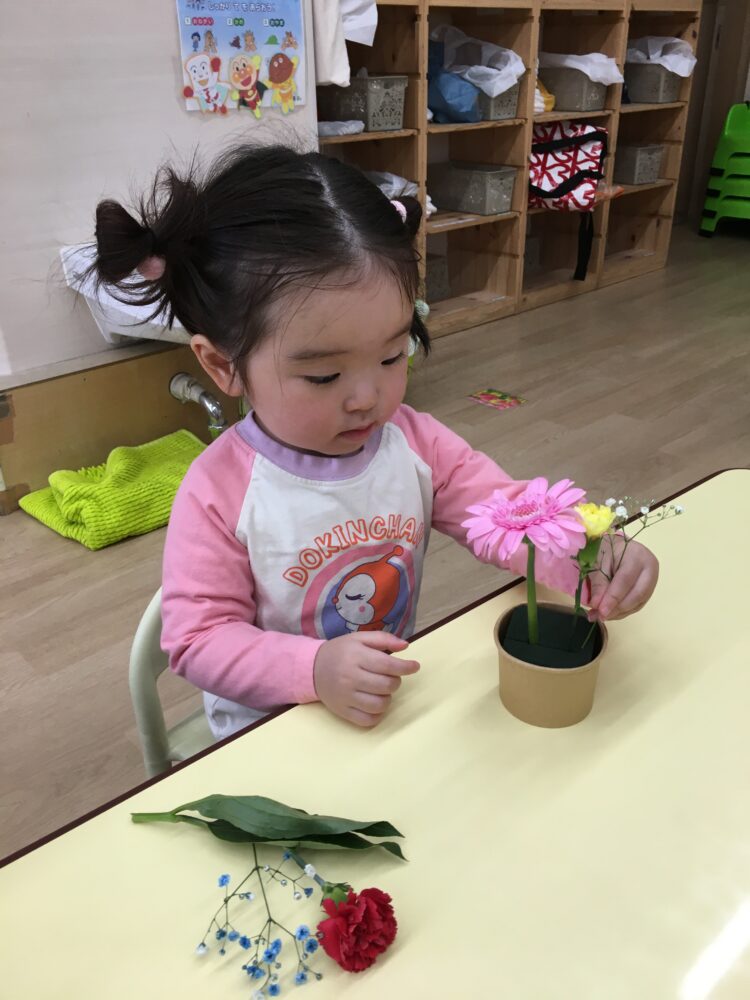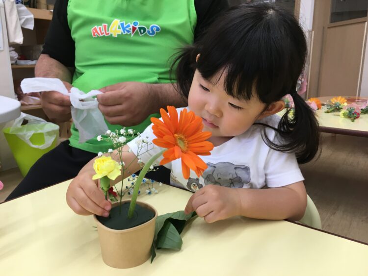 好きな花束を選ぶと、早く挿したくて、花束ごと挿してみようとするお友だちもいました🤭