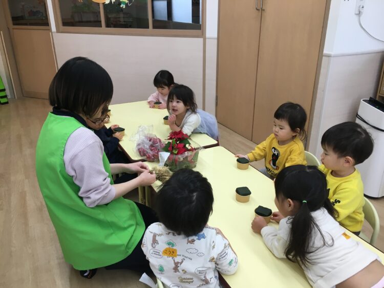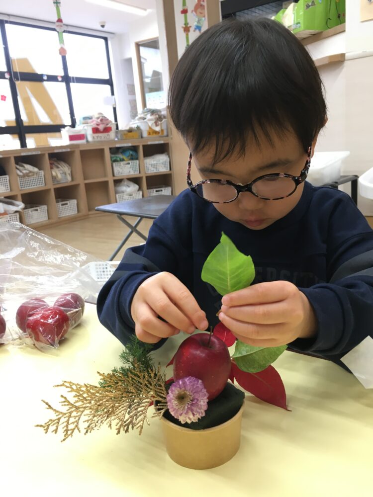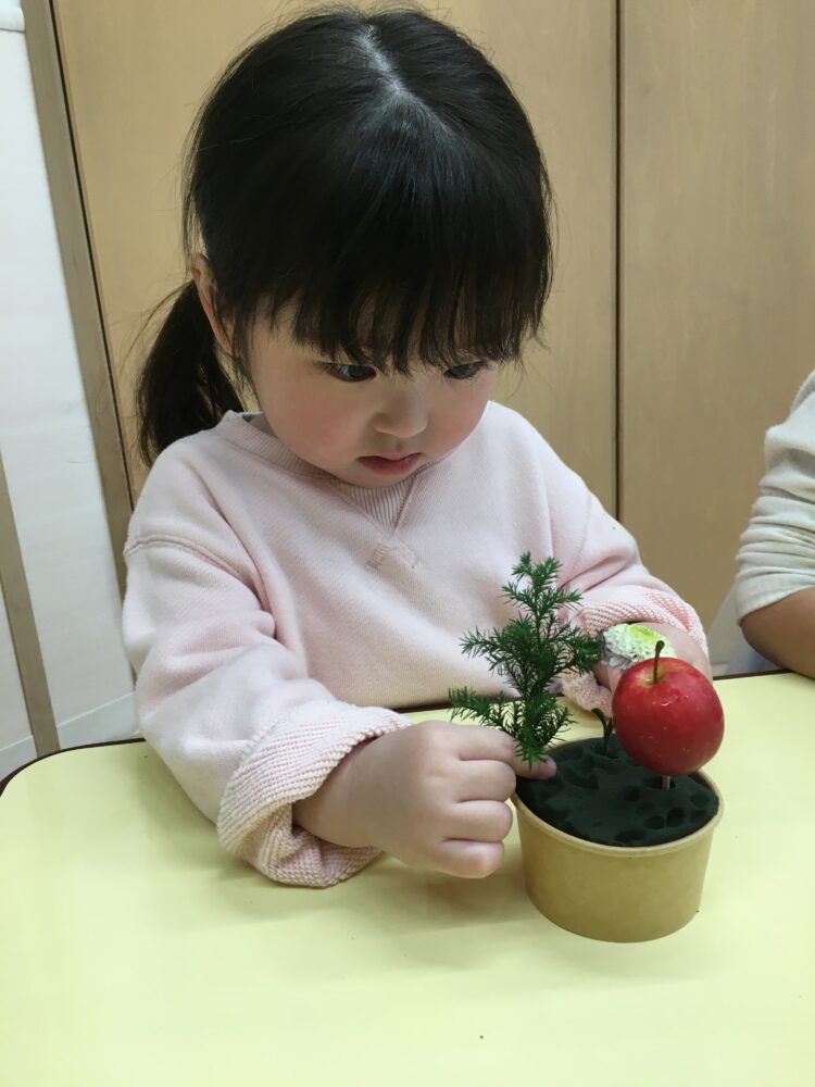 ヒノキの葉の金染めやポインセチアの葉の色や形を見ながら、「きれいだね〜」と感動したり、スプレー ピンポンマムを見て「かわいいね!」と声があがったりしていました。