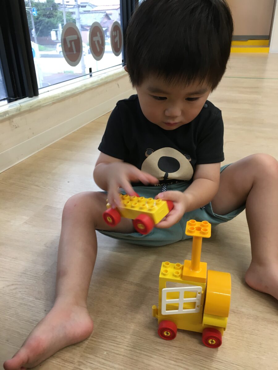 車輪の付いたブロックにいろんなブロックを付けて、貨物列車みたいに走らせている子もいました。
