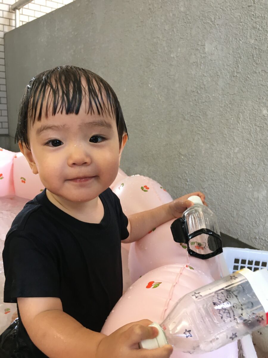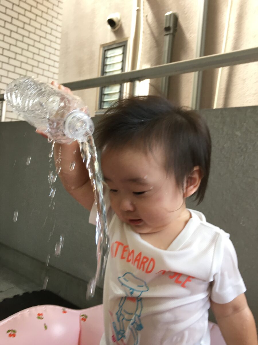 楽しくぱしゃぱしゃして遊んだり、ペットボトルから水が流れるのを楽しんだりしていました。