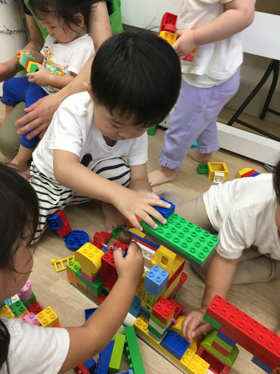 友だちと協力して動物園を作ったり、車輪の付いたブロックを連結させて電車を作って、楽しそうに走らせていました😄