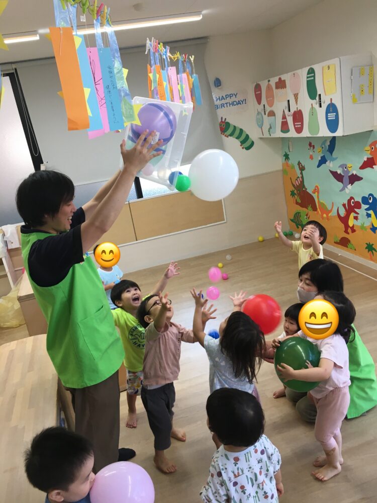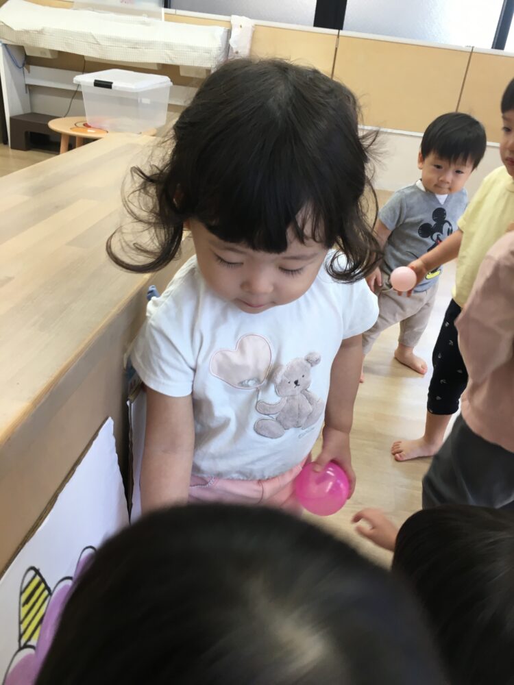 その後は、先生のエプロンや、箱の中に集めて高いところから落とす遊びは子どもたちに大人気でこの様子✨✨✨✨