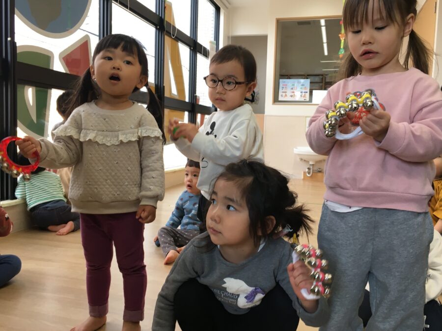 今年最後のリトミックは、タンバリン、マラカス、鈴を使いました。