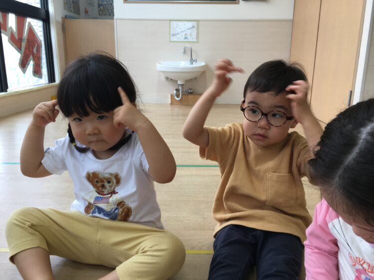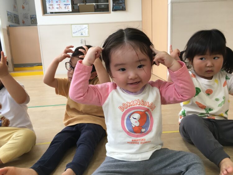 ピアノの音をよく聴いて、頭をちょんちょん、お膝をトントン🎶