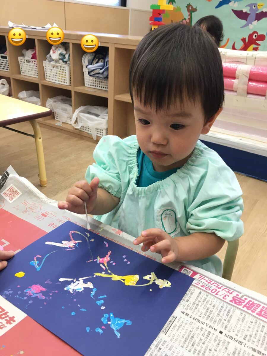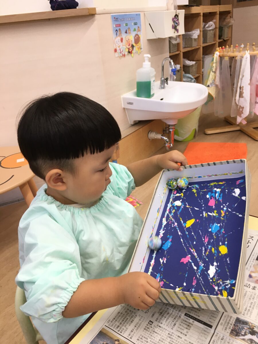 画用紙の上に絵の具を付けて、ばなな組さんは綿棒で描き、めろん組さんは、ビー玉をコロコロさせて描きました。