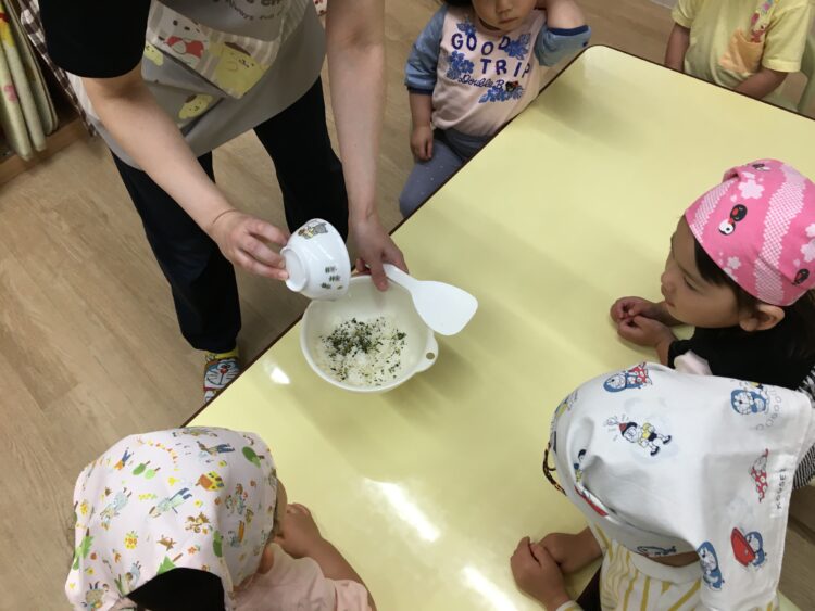 ふりかけをご飯にかけて混ぜる様子を、みんな覗き込むように見ていました。