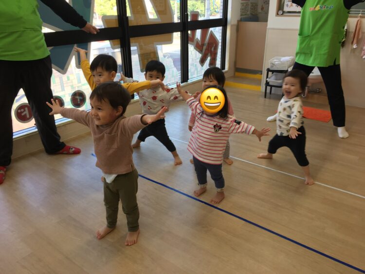 ばなな組さんは、講師の先生の掛け声に合わせてしっかりと体を動かし、準備体操が出来るようになってきました。