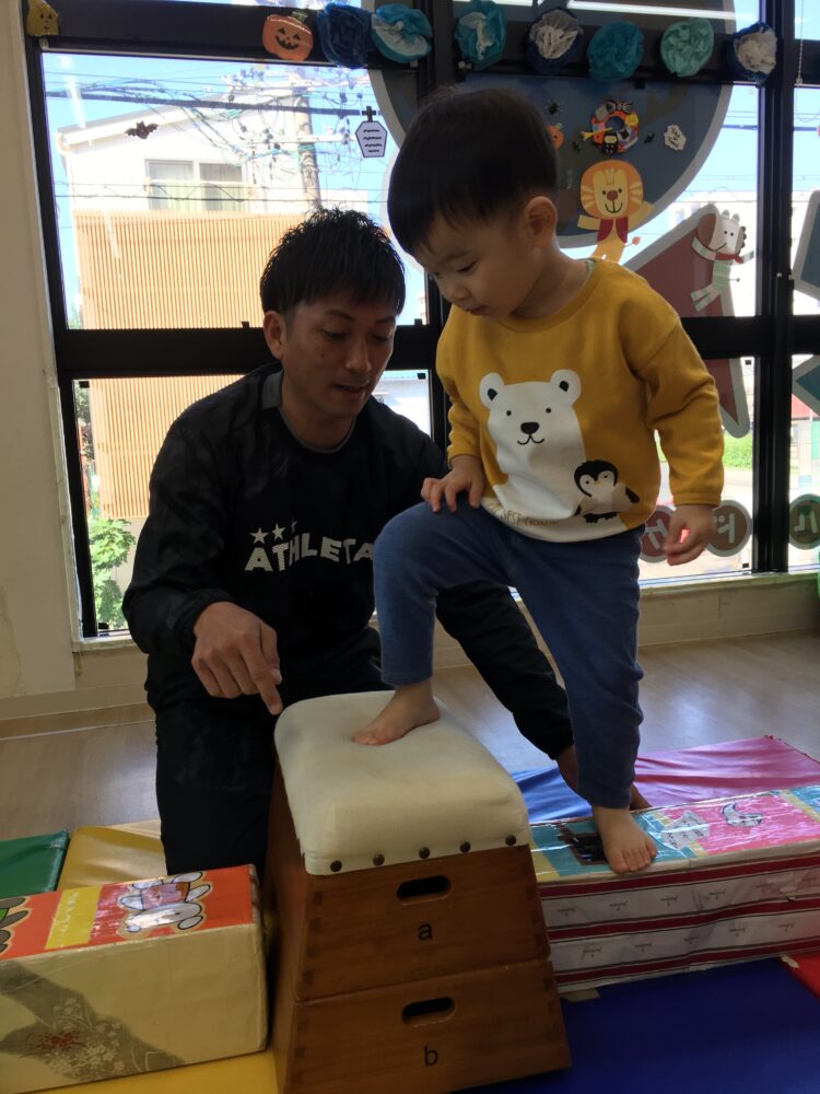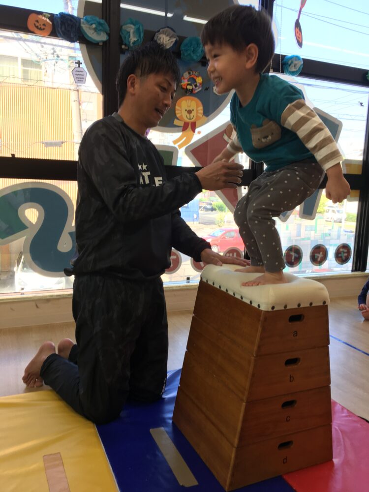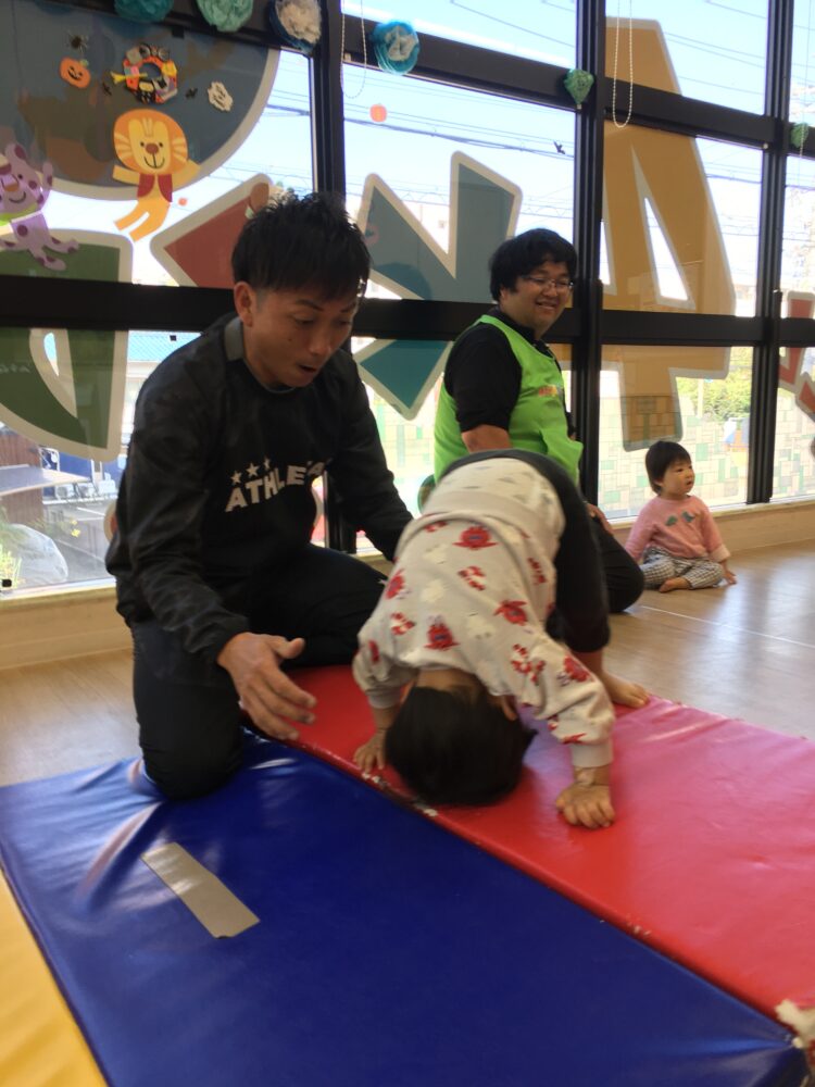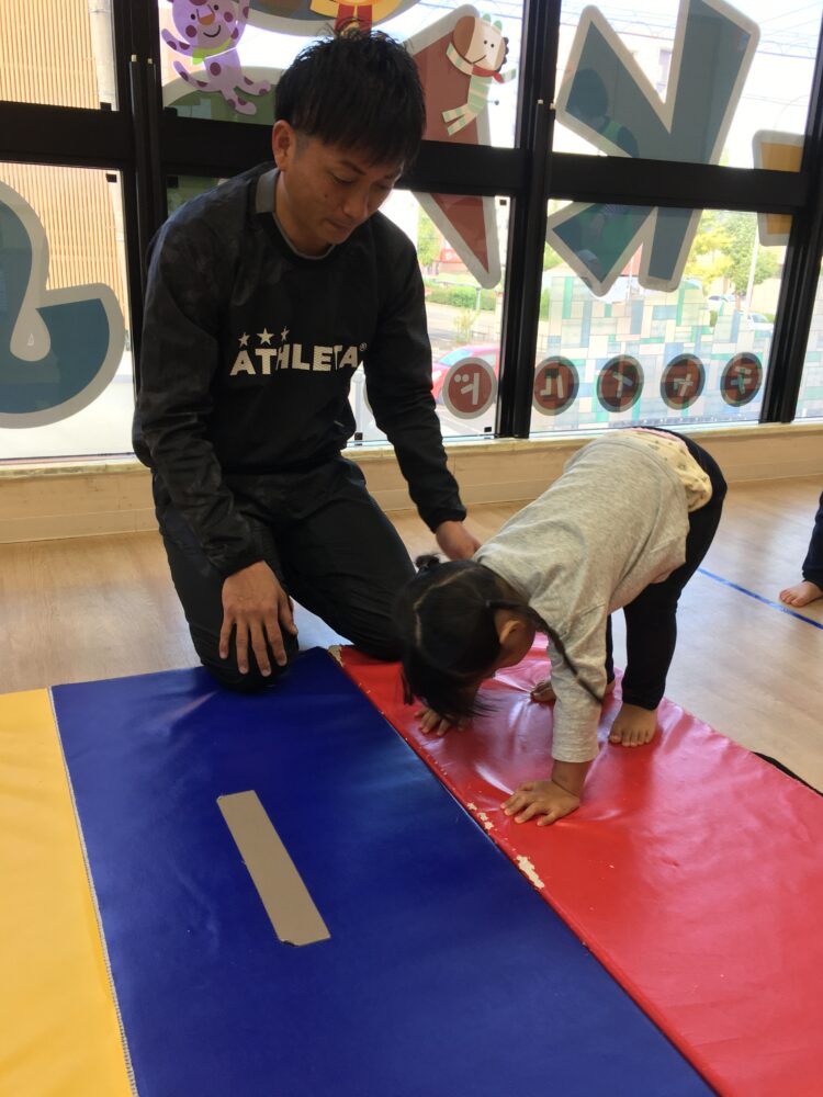 でんぐり返しは、講師の先生の補助がほとんどいらない子や、少しだけ手を貸してもらってスムーズにできる子もいて、それぞれの成長が感じられました。