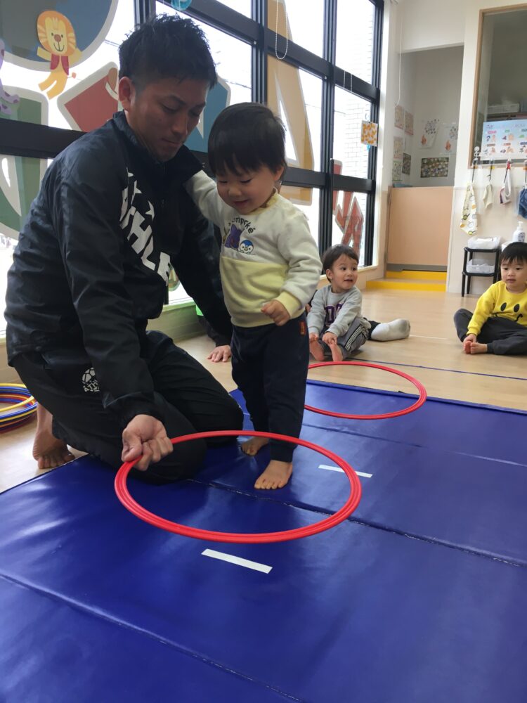 フープとマットの活動では、よろけながらも頑張ってバランスをとったり、先生にしがみついてみたりしながら前へ進んでいました💪