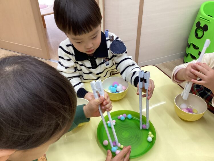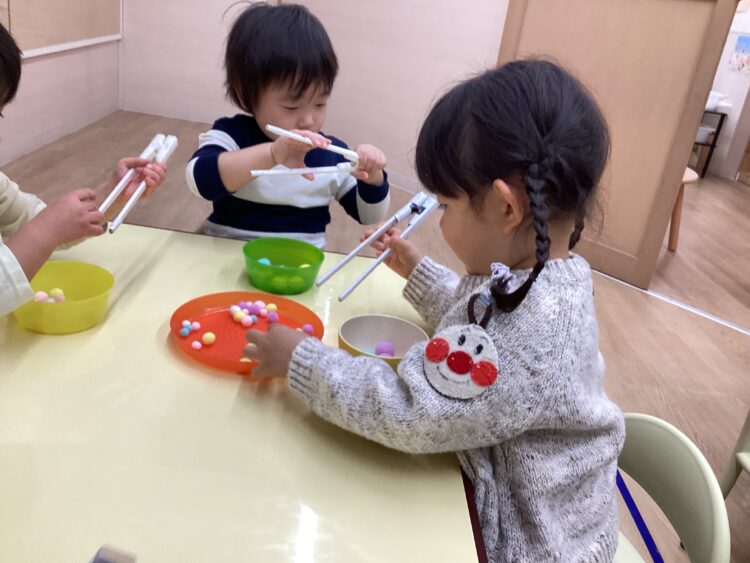 めろん組さんは、お箸の練習に向けて指先トレーニング😉