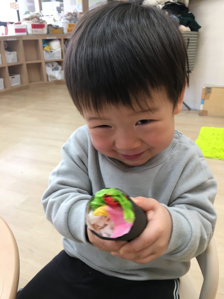 いちご組さんはお花紙を海苔巻きに詰めて恵方巻きを作りました✨とっても美味しそうに作れました😊