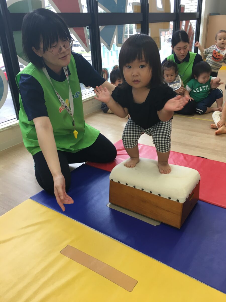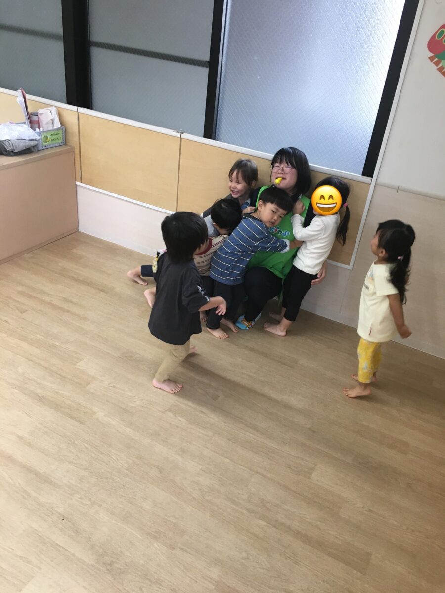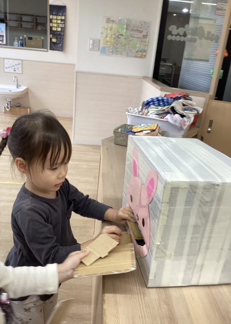 順番に先生に向かってよーいどんをしたり、跳び箱の山を超えたり、手裏剣に見立てたダンボールを敵の鬼さんやうさぎさんの口の中に入れたりしました。たくさん手裏剣を入れられたね😊