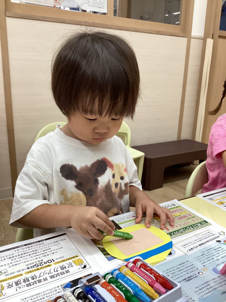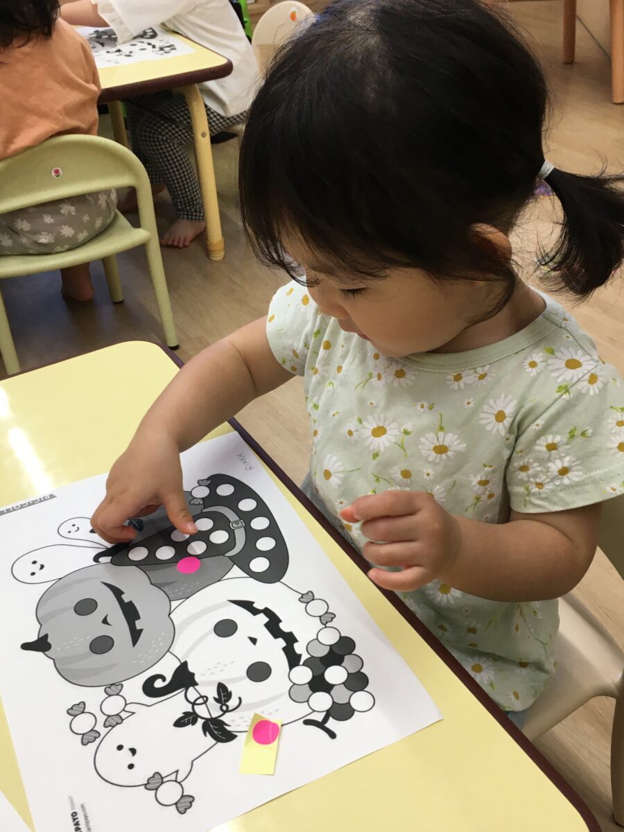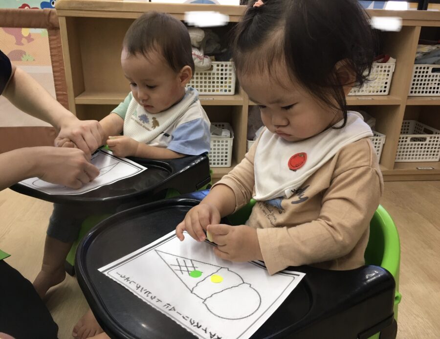 台紙からいろんな色のシールを剥がして、「あか」や「みどり」など言いながら貼り、カボチャやアイスのイラストを可愛くしていたね😊