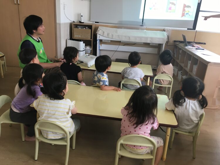 まずはプロジェクターを使ってバイ菌と手洗いのお話🙂