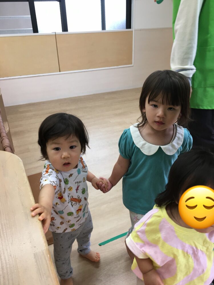 まず手繋ぎ遊びでは、めろん組さんとばなな組さんとペアで手を繋いで園内をお散歩🎶