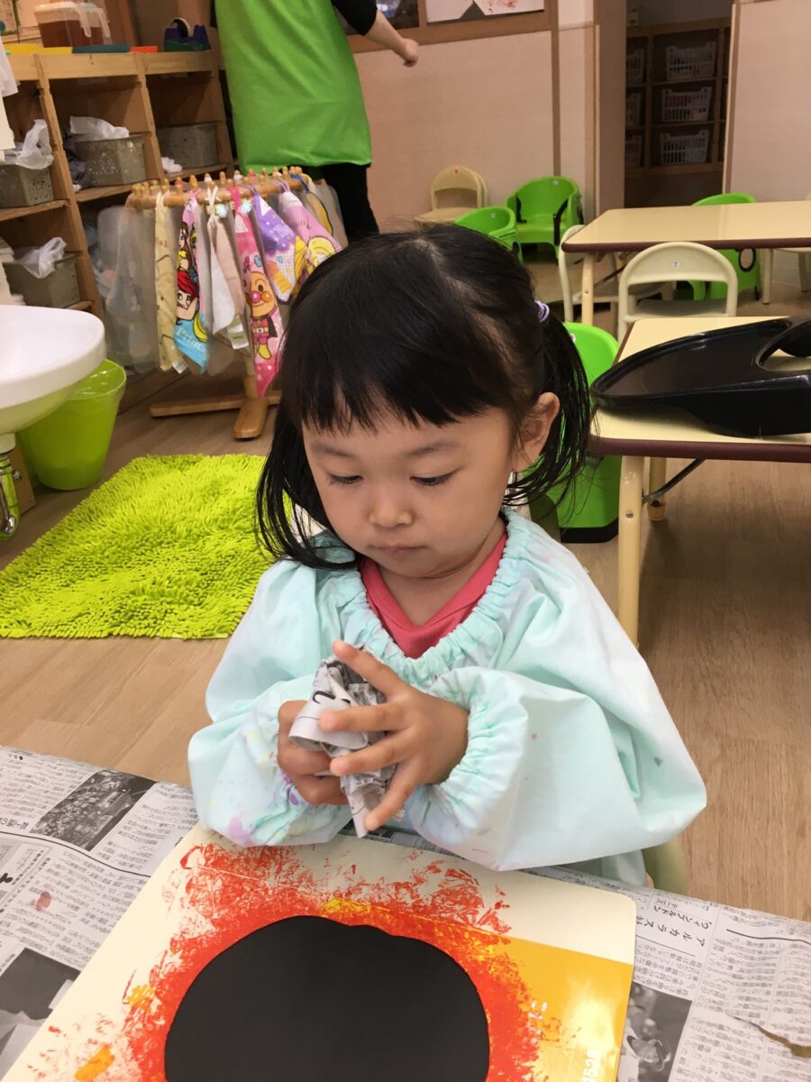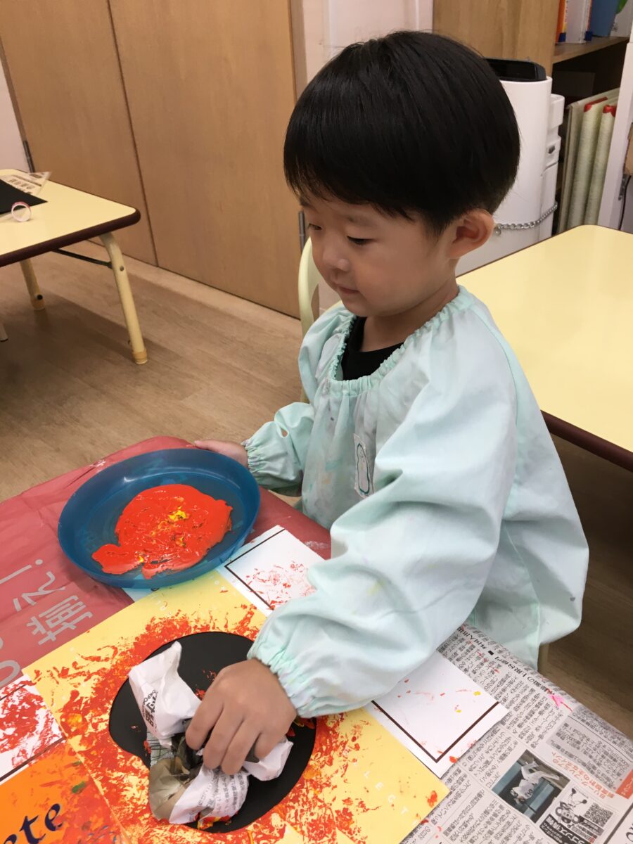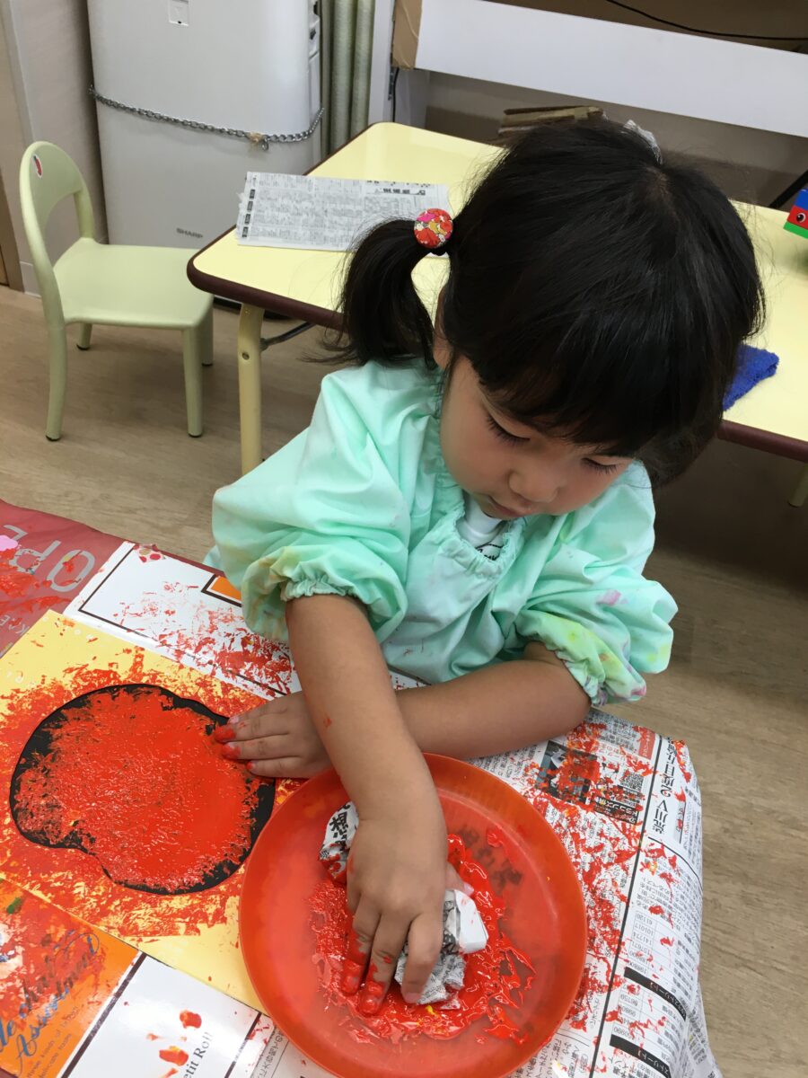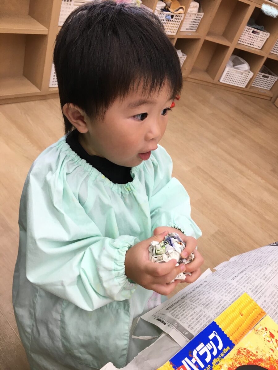 今日はめろん組さんが新聞紙スタンプをしました。