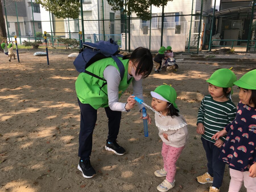 シャボン玉遊びでは、子どもたちも吹いて遊びました😙