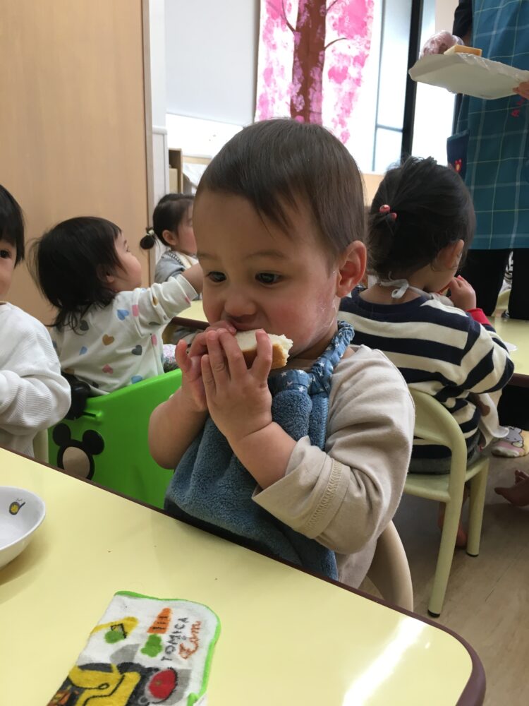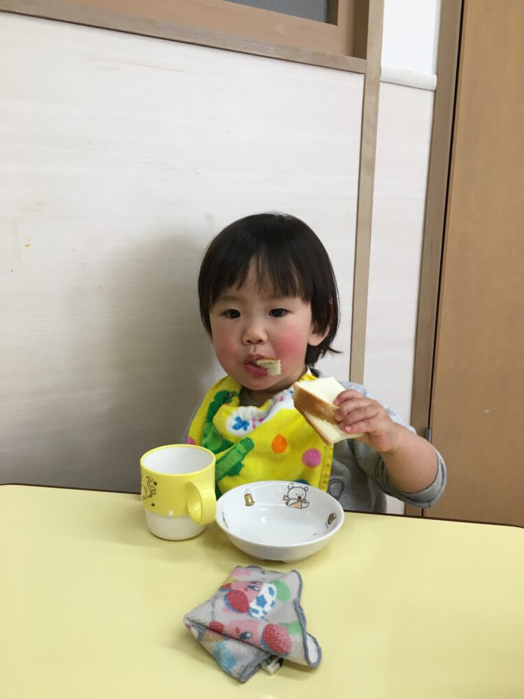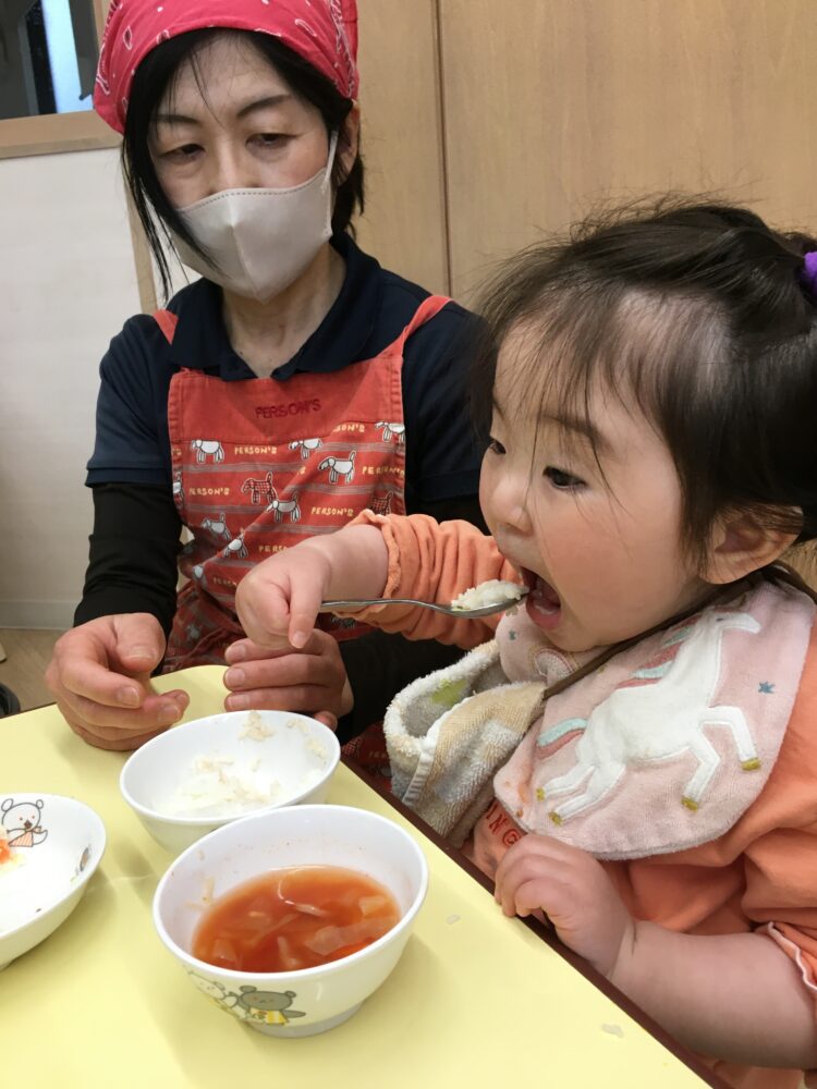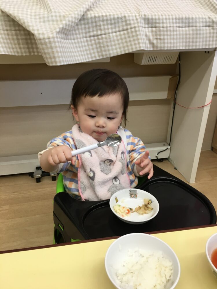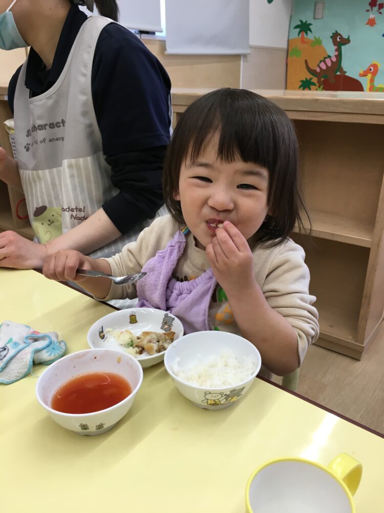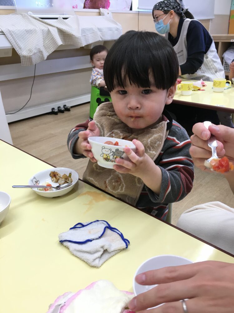 お友達が「おかわりー」と先生に伝えると、まだ食べ終わっていなくても、便乗して「おかわりー」という姿があり可愛らしいです笑