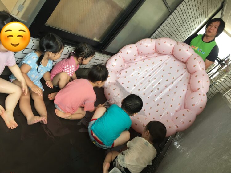 水遊びのお片付けの際、先生が「波がくるぞー!」と言いながら、プールの水を一気に流すと、「わぁ〜」と言ったり、流れてくる水をチャプチャプさせたりして、楽しんでいました。