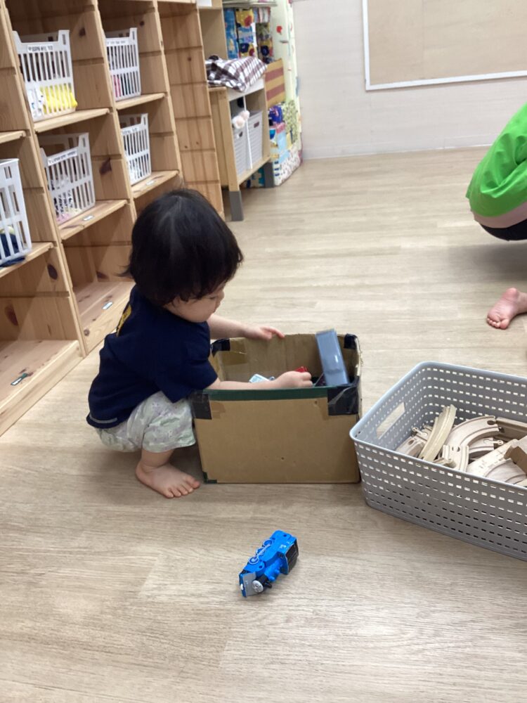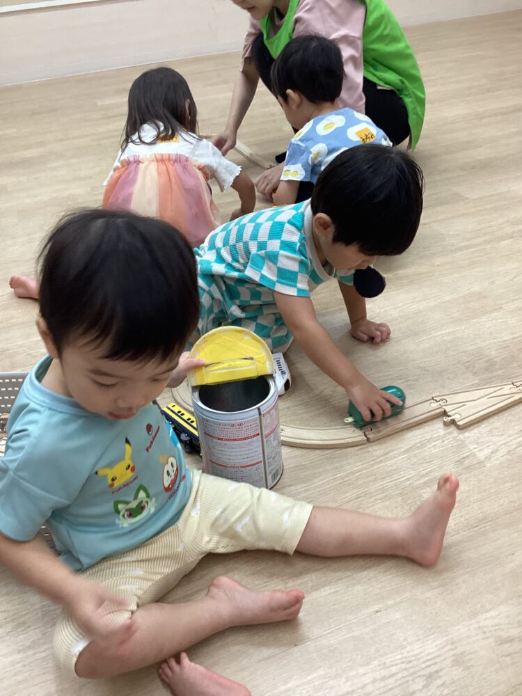 電車やぽっとん落としで遊んだ子どもたちは、先生が敷いた線路で電車を楽しそうに走らせたり、お友だちと仲良く穴にメダルを入れたりしていました🚂