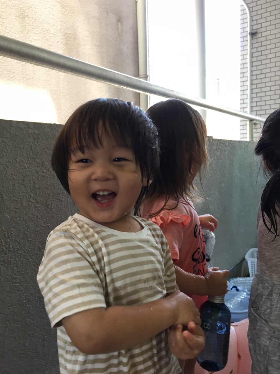 ペットボトルのじょうろや空き容器に水を交互に入れて楽しんでいたり、先生のシャワーに「雨だぁ〜」と喜んでいたりしていました😊