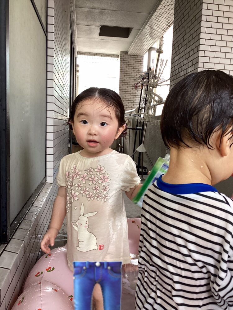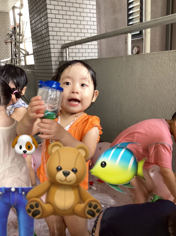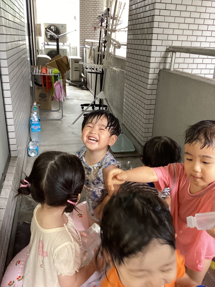 ペットボトルのじょうろを使って、お友達同士でお水を掛け合い、頭から流すと「あわわわわわ〜〜」と気持ちよさそうに反応していました🤗