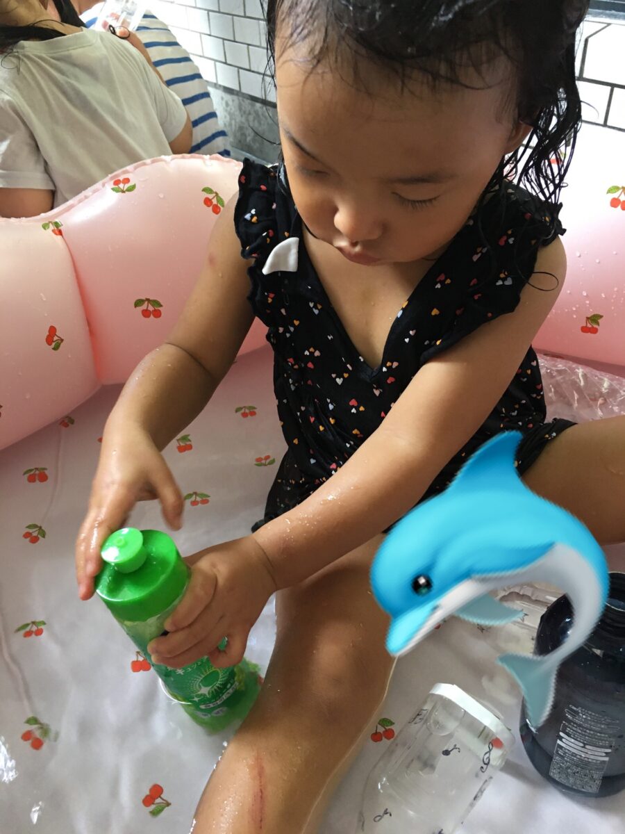 水遊びでは、遊んでいるうちに子ども達が容器を並べて、「ジュース屋さんでーす」「どうぞーどうぞー」と遊びが展開されていました♪