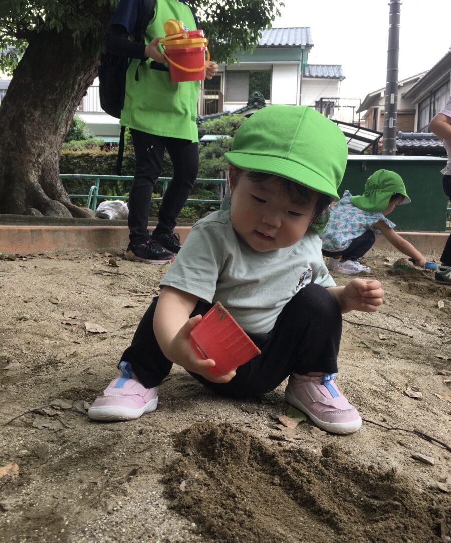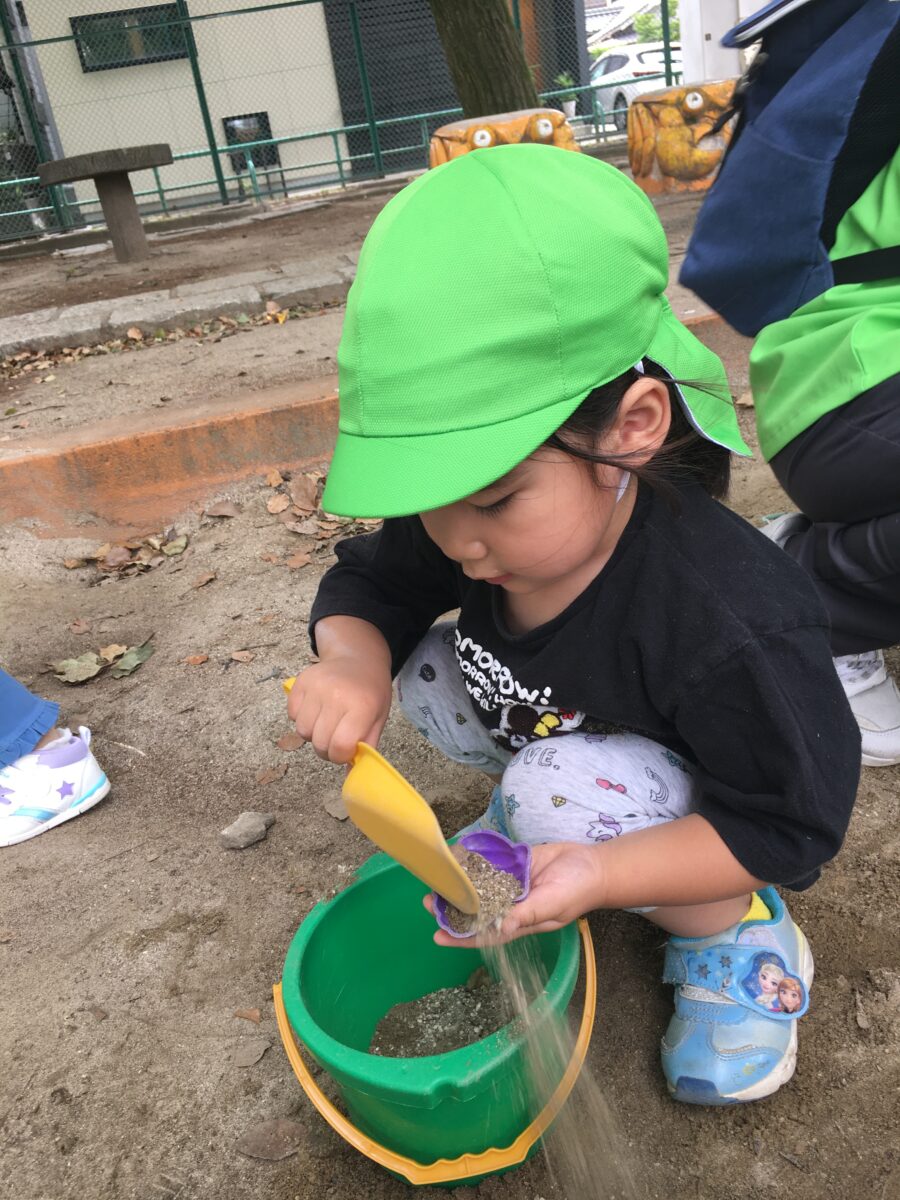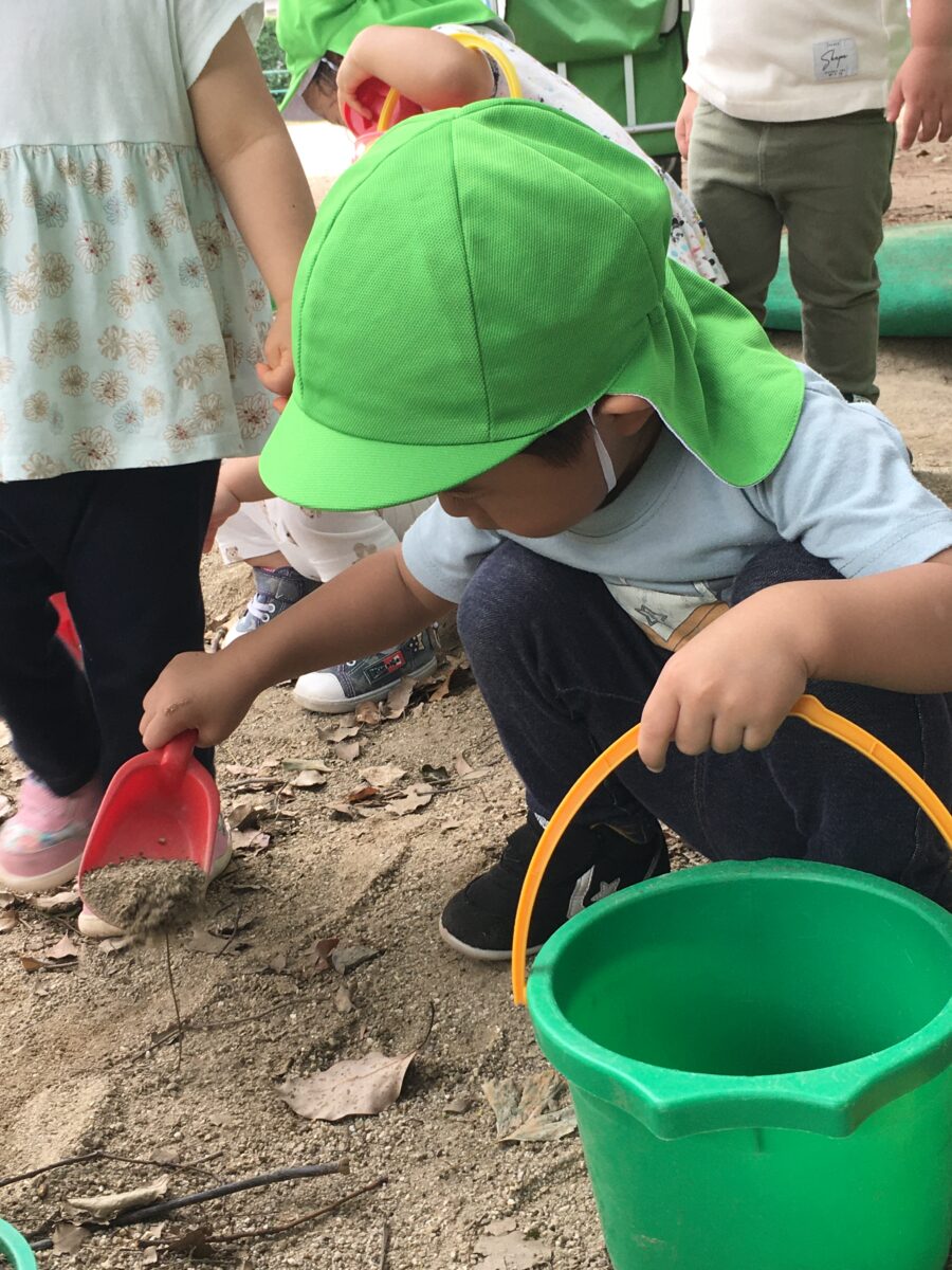 バケツや砂型に黙々と砂を入れていく子どもたち。
