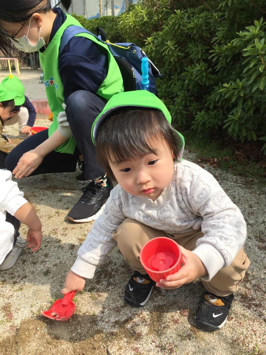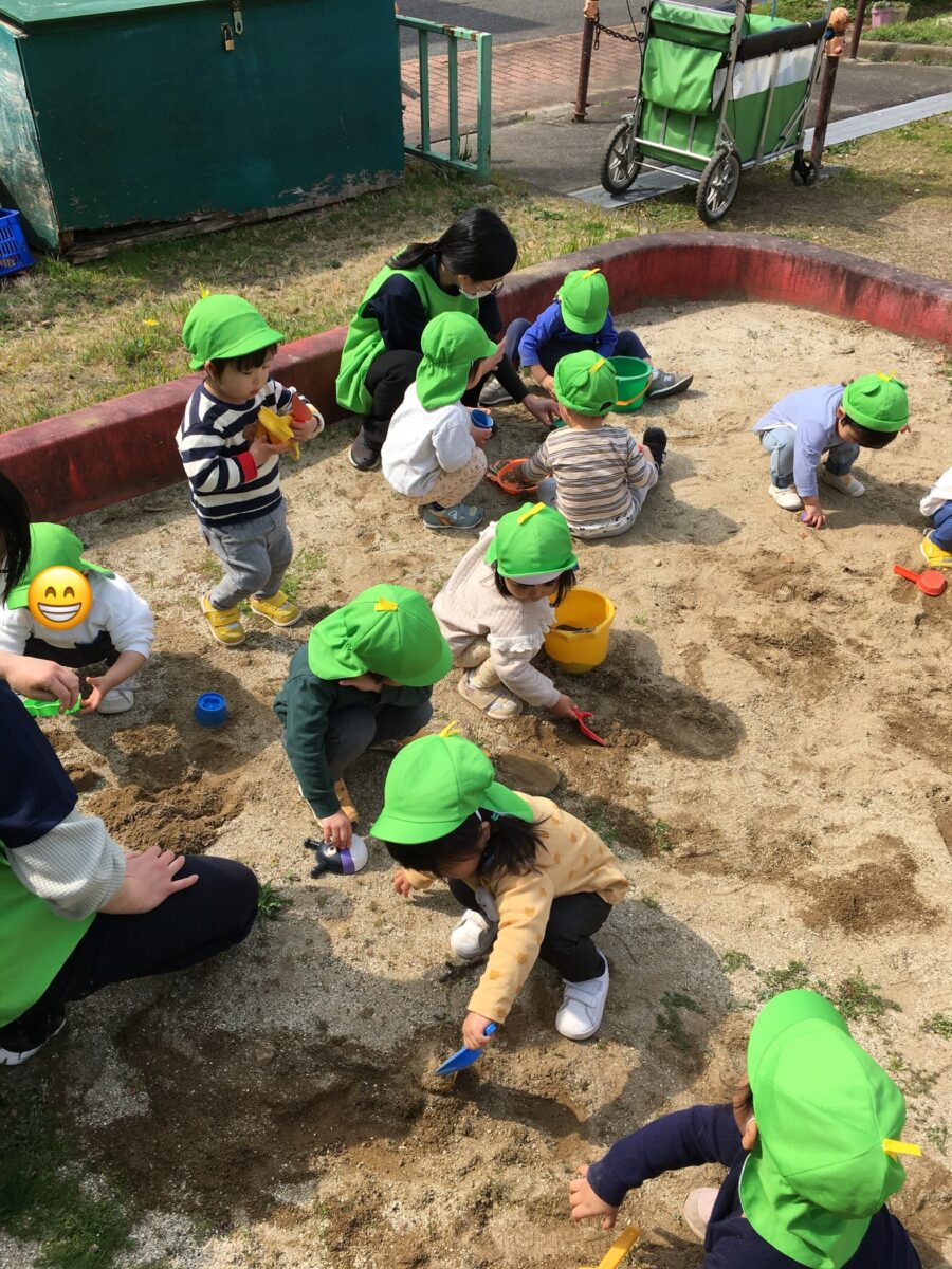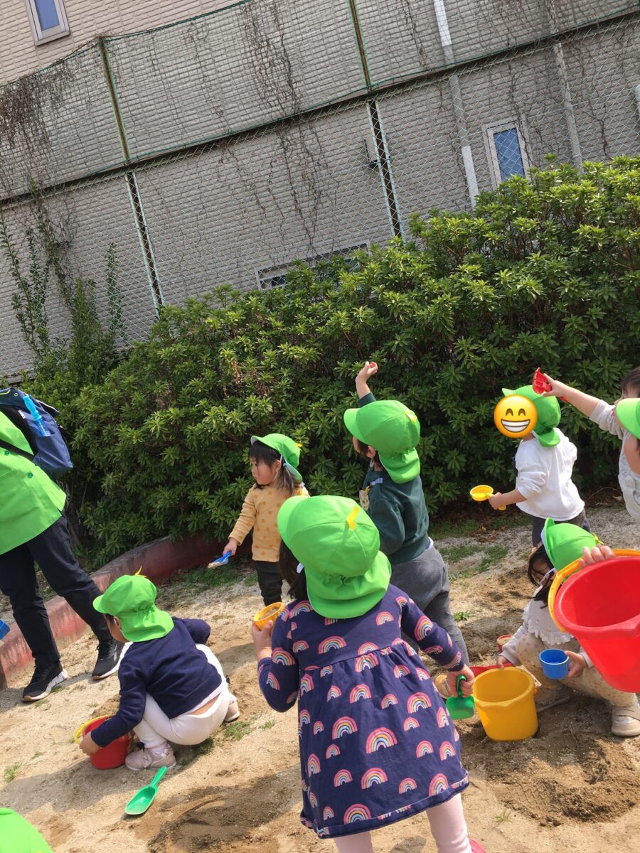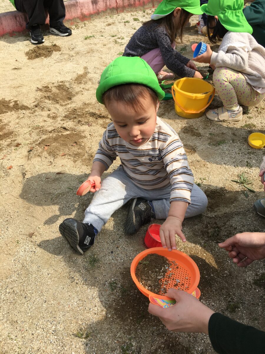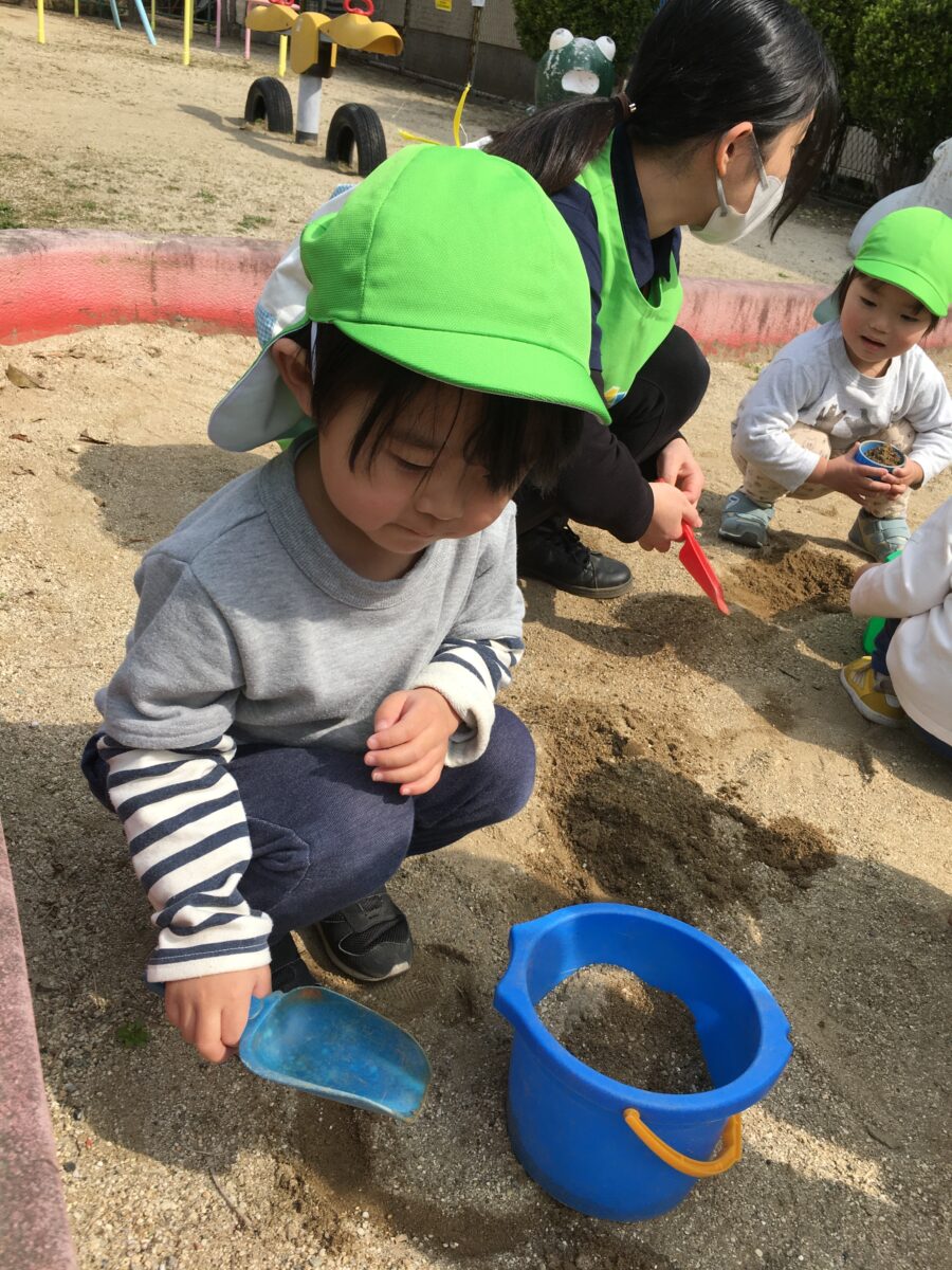 バケツの中にたくさん砂を入れていたり、熊手で砂をかき集めたり、型で固めた砂を使ってケーキ屋さんをしたり、お山を作ったりと、みんな思い思いに楽しく遊んでいました。